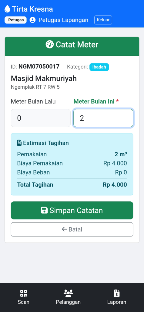 Untuk meningkatkan kualitas pelayanan, Unit Air Bersih BUMDes Kresna menerapkan sistem pencatatan meter air pelanggan secara rutin setiap bulan.